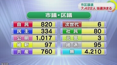 党派別では、▽自民党が820人、▽民主党が334人、▽公明党が1017人、▽維新の党と大阪維新の会が合わせて97人、▽共産党が760人、▽次世代の党が6人、▽社民党が80人、▽日本を元気にする会が3人、▽諸派が95人、▽無所属が4210人です。自民党と共産党は前回の当選人数を上回っています。